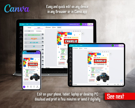 Lego Monster Truck customizable invitation template | Share or Print | boy | TP953