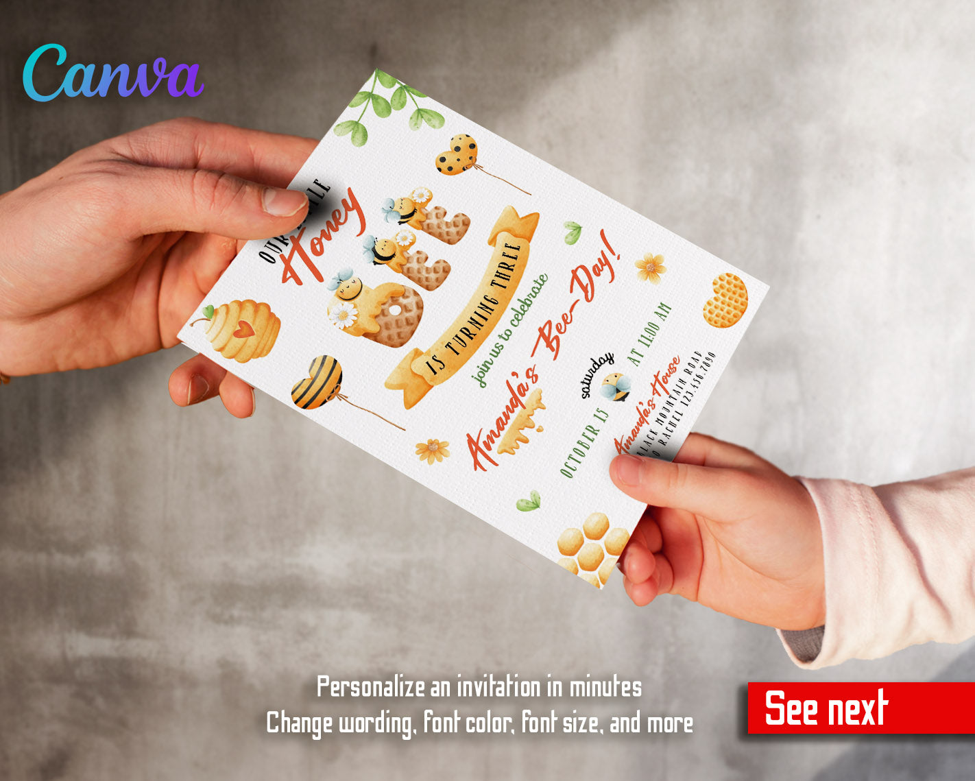 How it works: After the purchase you get a file attached to your order with links to edit your invitation in Canva. You can change the wording and even customize the colors, sizes and fonts of the wording in text blocks. This digital invite can be printed or text messaged.