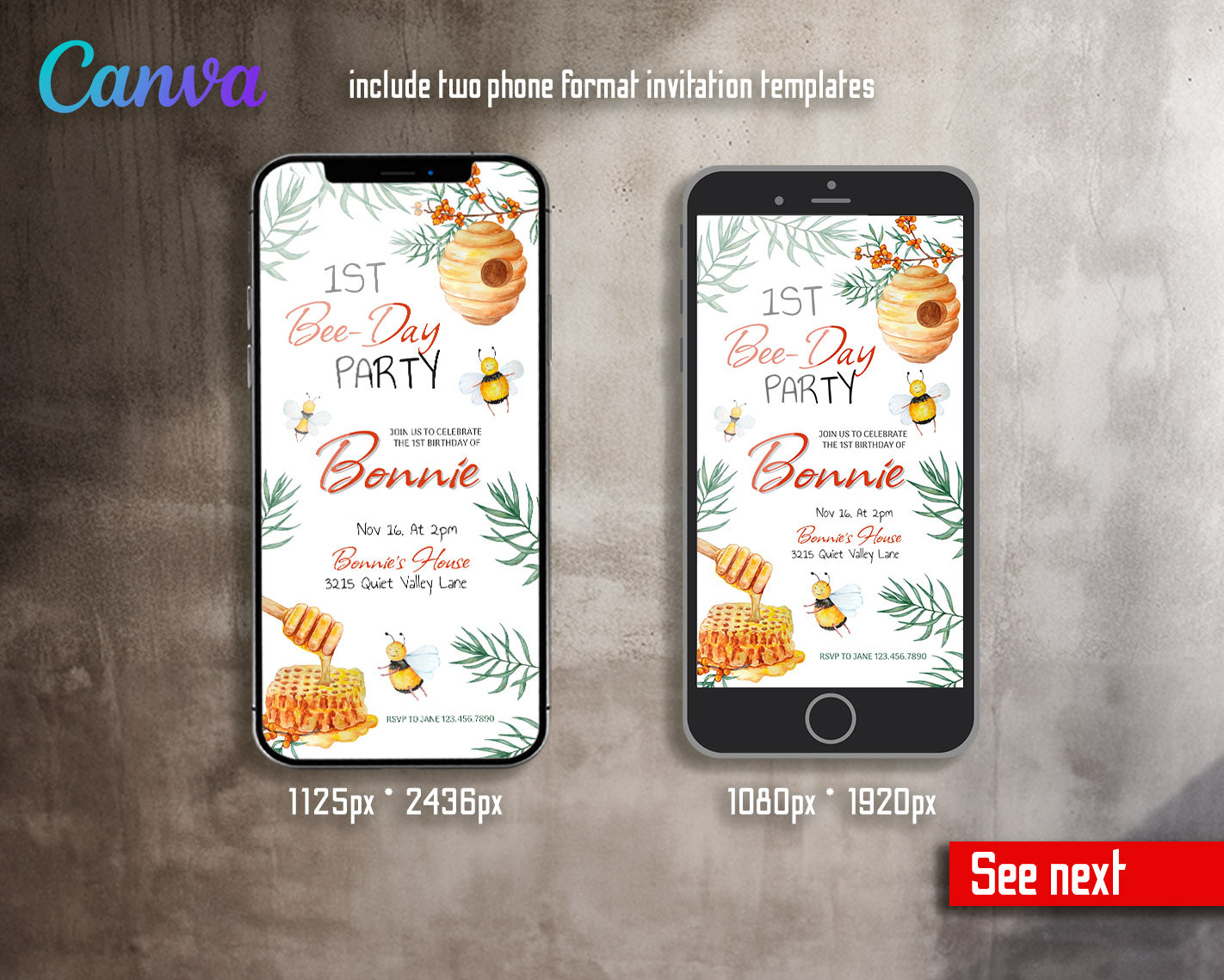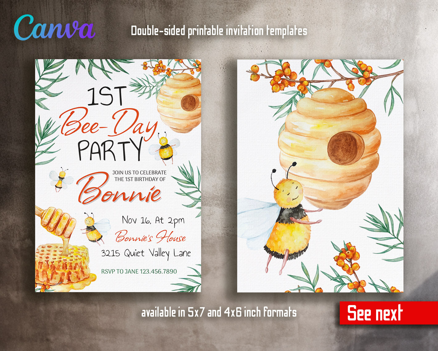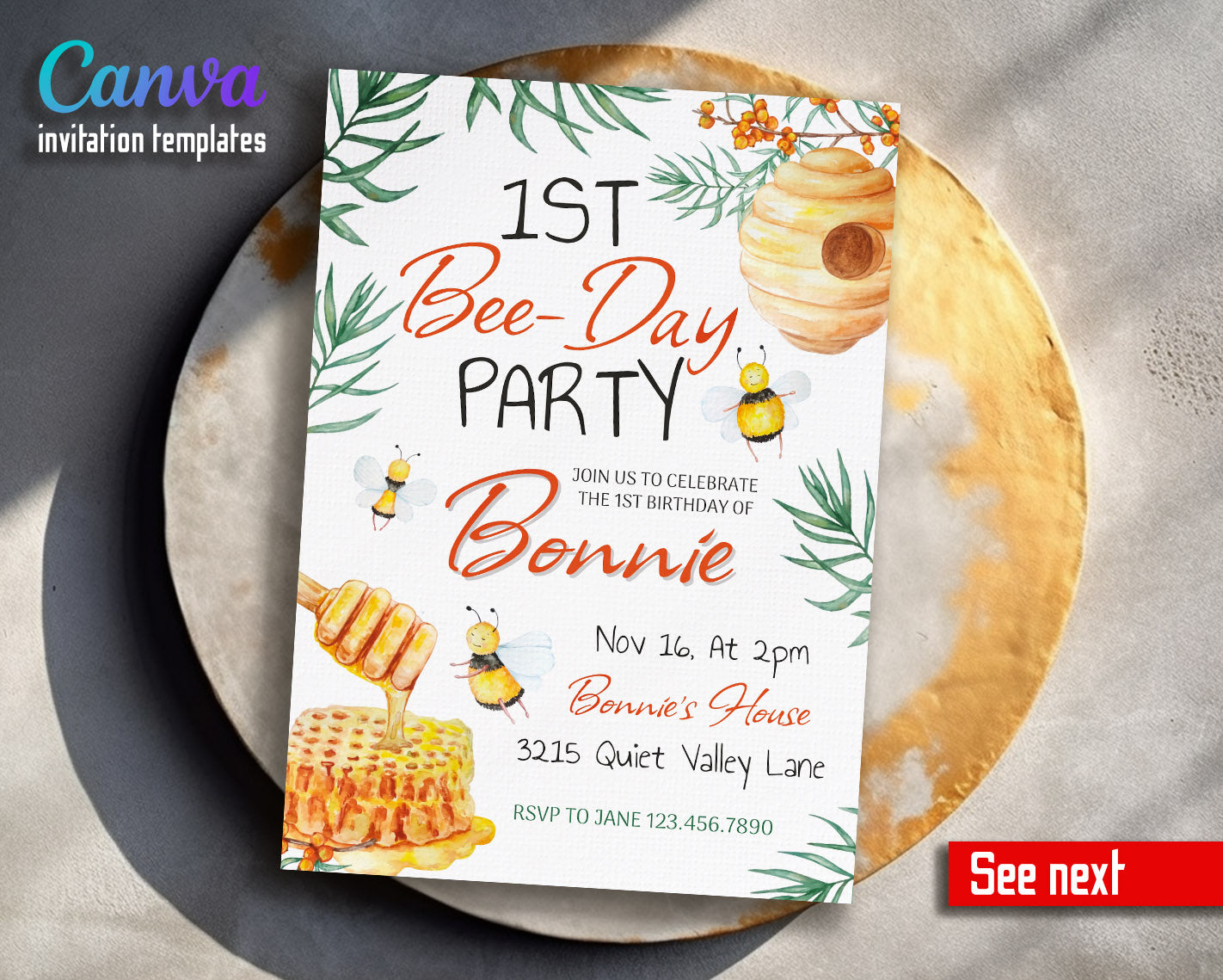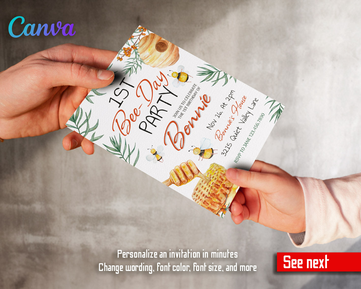 Printable Editable customizable 1st Bee Day Party birthday party invitation digital template. Instant download invite.