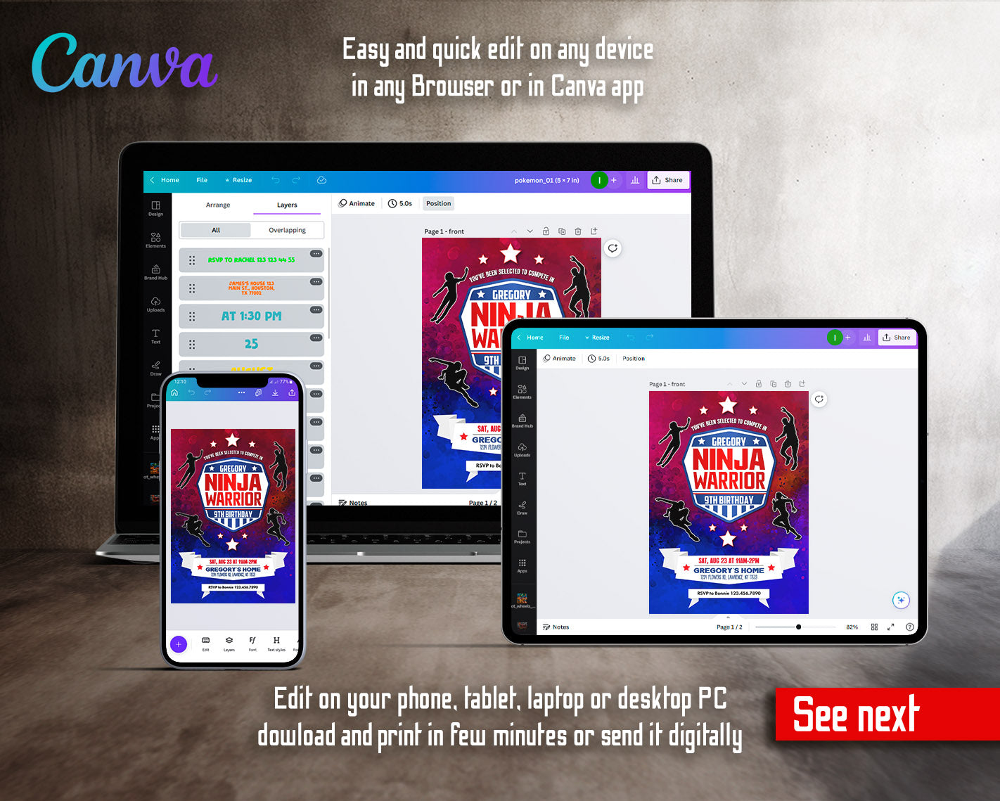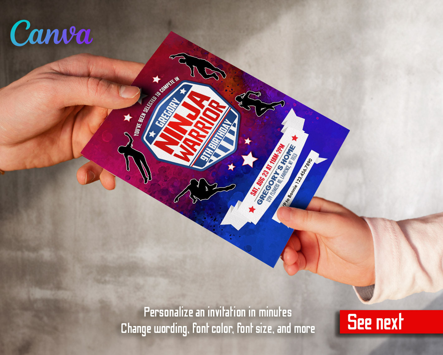 Related Tags: ninja invitation, warrior birthday, ninja warrior invite, american ninja, american warrior, digital invite, editable invitation, birthday invitation, printable invitation, climbing invitation, Australian Ninja, girl birthday,