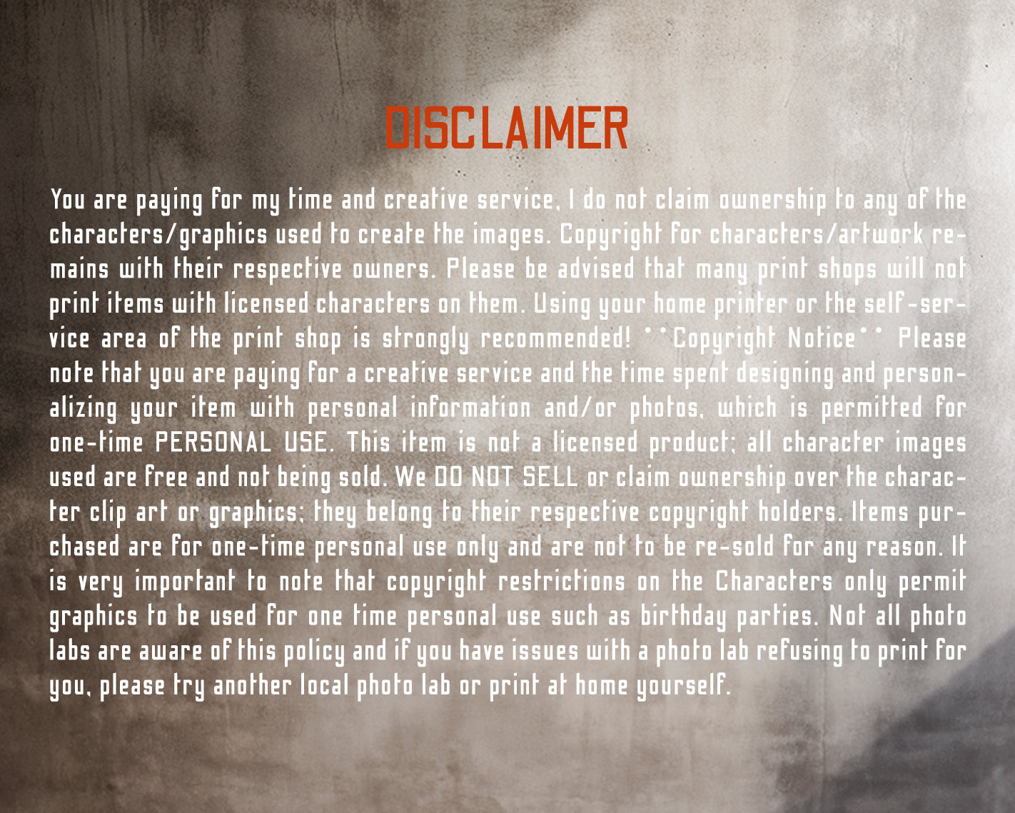 Please note that some print shops may refuse to print items with licensed characters on them, so it is recommended that you use your home printer or the self-service area of a print shop. Also, please remember that copyright restrictions on the characters only permit graphics to be used for one-time personal use, such as for a birthday party.