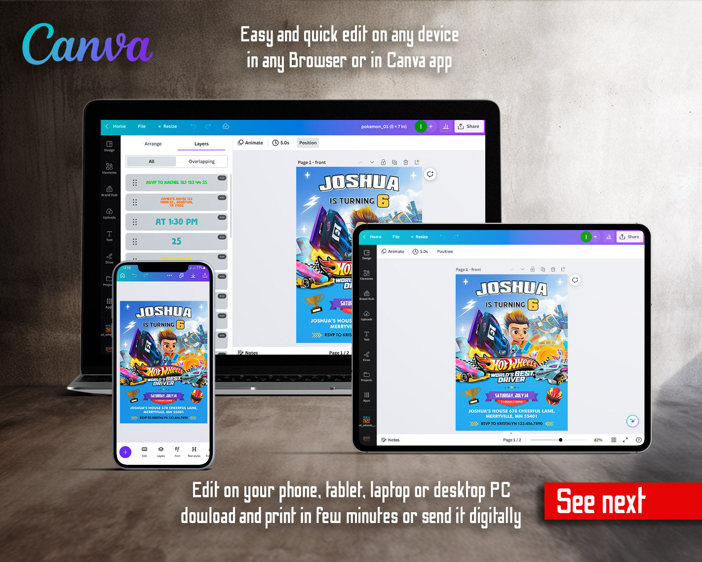 All the invitations are for self-editing. You will edit your template in Canva. It’s easy whether you're using the web browser or the app.